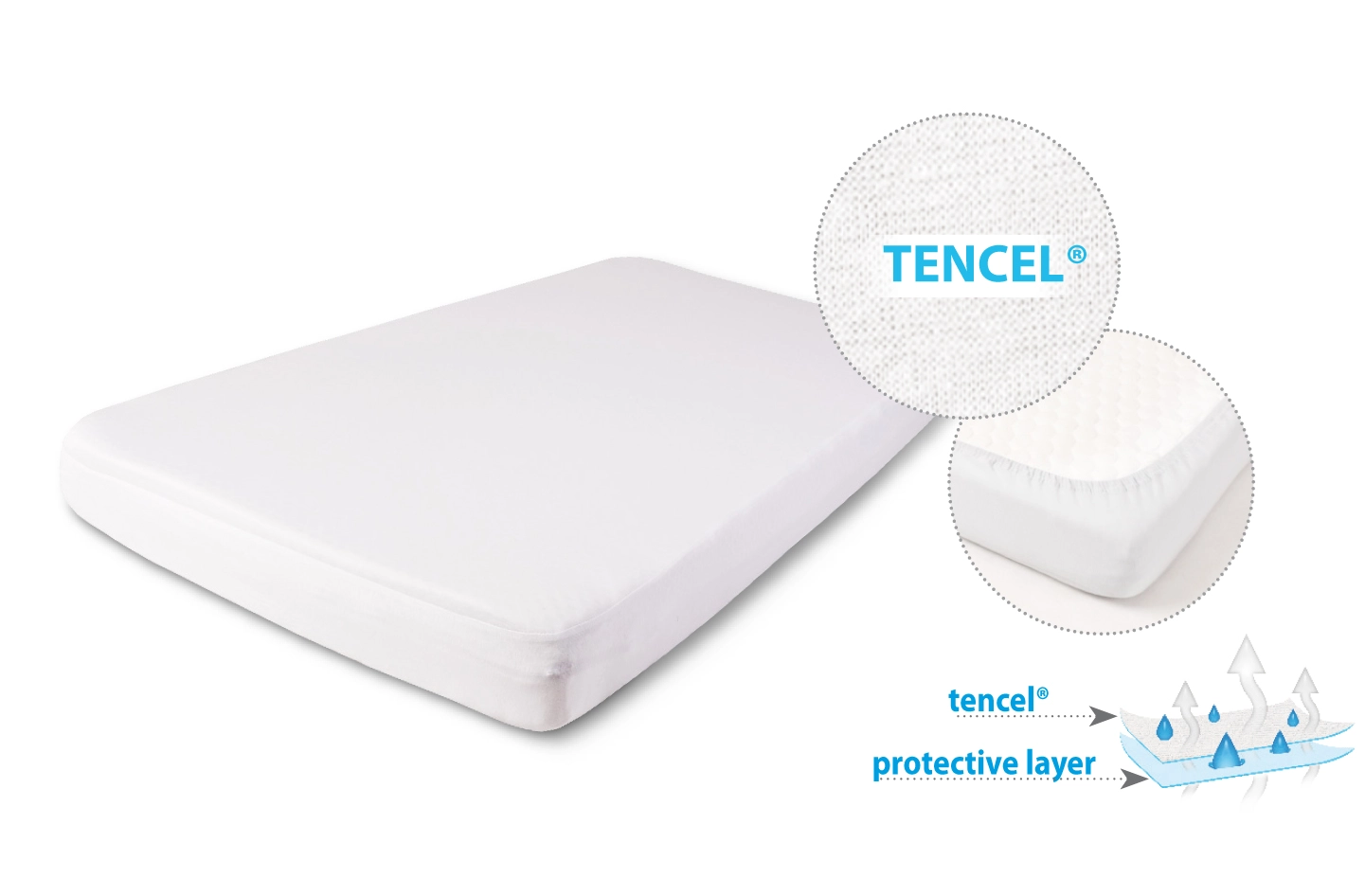 Le drap-housse réversible en fibre naturelle Tencel allie la douceur de la soie et une grande capacité d’absorption à la résistance et à la facilité d’entretien. La couche inférieure en membrane PU respirante empêche la pénétration des liquides tout en laissant le matelas respirer – un choix idéal pour les enfants et les allergiques sensibles.
