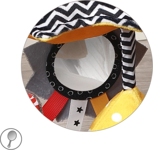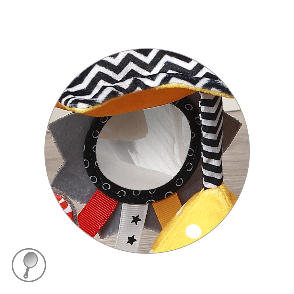 Les motifs noirs et blancs avec des accents colorés stimulent naturellement la vue, et le miroir favorise la conscience de soi ainsi que la coordination œil-main.