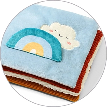 Des matières toutes douces, des détails en relief et des effets bruissants stimulent le toucher, l’ouïe et la curiosité naturelle de bébé à chaque page tournée.