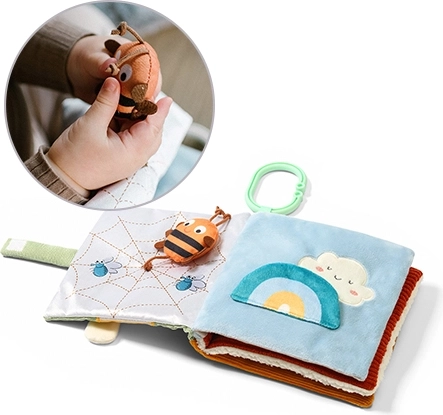Le clip pratique permet une fixation aisée à la poussette, au siège auto ou au lit bébé, idéal à la maison et en voyage. Le livre est léger et compact pour les petites mains, et ses couleurs naturelles et feutrées avec des motifs d’animaux n’attirent pas excessivement l’attention tout en stimulant délicatement la vue. Les cordelettes, petits nœuds et parties amovibles à velcro encouragent l’entraînement de la préhension et la coordination.