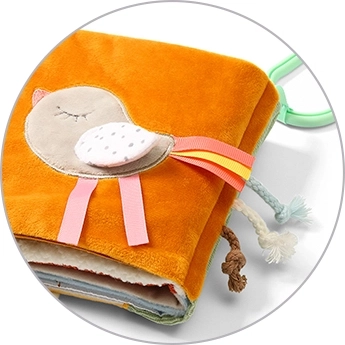 - Pages bruissantes, miroir, textures variées, éléments amovibles à velcro, élément pouet, rubans et petits nœuds