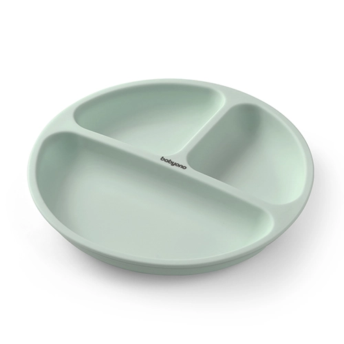 Découvrez une table futée avec l’assiette bébé en silicone BabyOno. La grande ventouse adhère fermement aux surfaces lisses et aide à prévenir les renversements ou les chutes de l’assiette. Trois compartiments séparent les portions et facilitent l’introduction de nouveaux aliments au menu.