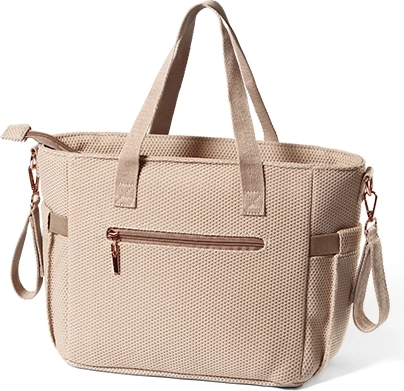 Le sac se porte à la main, à l’épaule ou en bandoulière grâce à la longue sangle. Il se fixe aussi facilement à la poussette pour garder les mains libres.