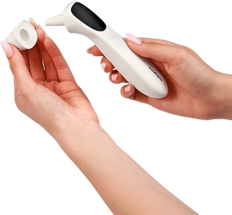 Utilisation simple et rapide avec un seul bouton. Choisissez la mesure sans contact sur le front ou le mode précis dans l’oreille et obtenez le résultat en 1 s.