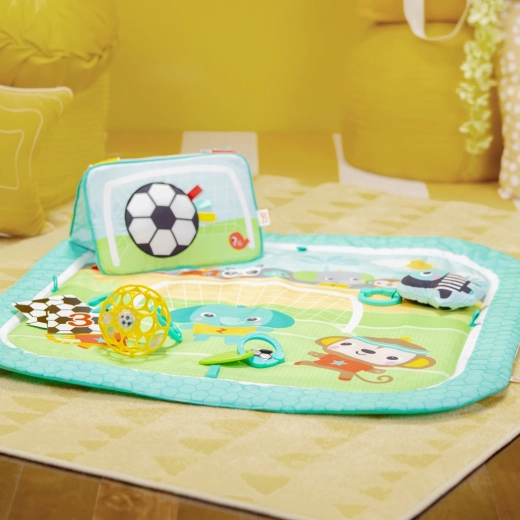 Inclus : 4+ jouets amovibles : cartes avec chiffres et animaux, toucan en peluche avec grelot, feuilles texturées – anneau de dentition et classique OBALL facile à saisir. Encouragez chaque « but » de votre petit footballeur au quotidien.