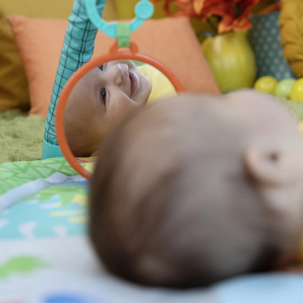 Un miroir sécurisé, des anneaux, un soleil et un jouet/anneau de dentition en forme de feuille soutiennent la conscience de soi et l’éveil sensoriel.