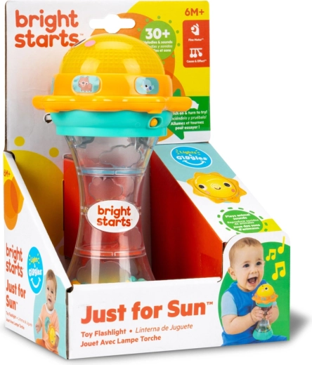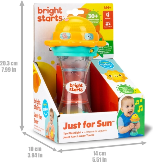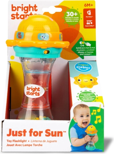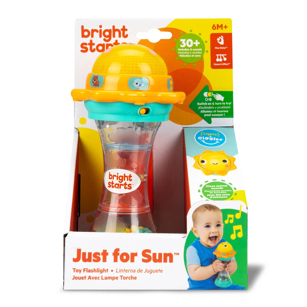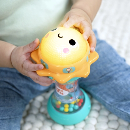 Just for Sun est un jouet joyeux pour tout-petits qui combine lumières, sons et mouvement en une activité captivante. Les enfants seront fascinés par le dôme lumineux en forme de soleil qui, lorsqu’on le tourne, joue plus de 30 mélodies et sons (chat, ours, grenouille, singe, oiseau, lion). En le secouant, les billes colorées roulent dans la chambre transparente et créent un effet apaisant de gouttes de pluie.