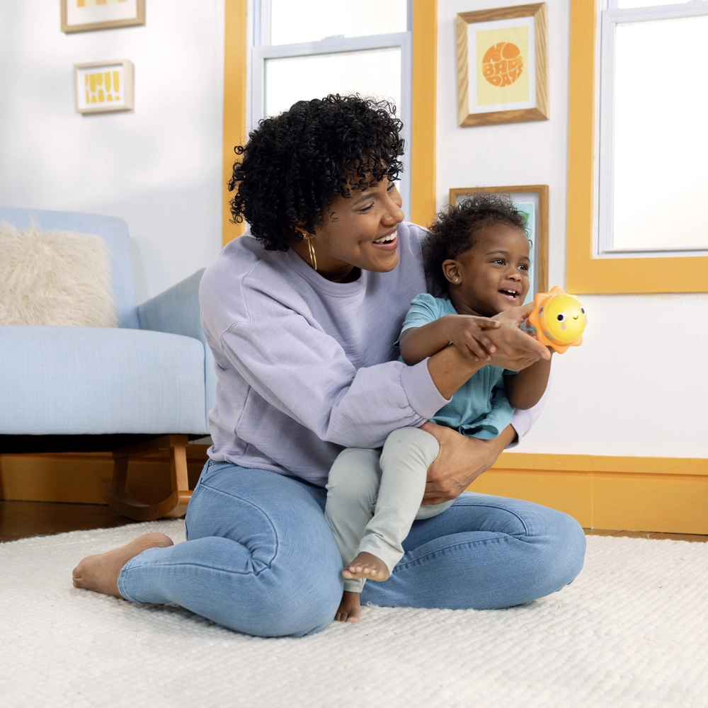 Tournez le petit soleil lumineux et découvrez plus de 30 mélodies et sons d’animaux (chat, ours, grenouille, singe, oiseau, lion). Idéal pour développer l’ouïe et l’apprentissage de la relation cause–effet.
