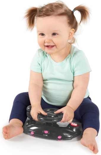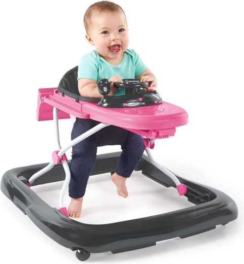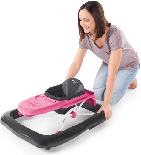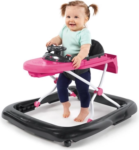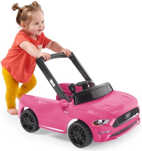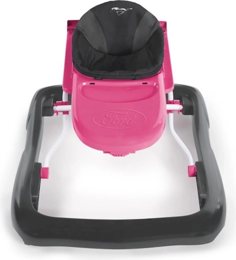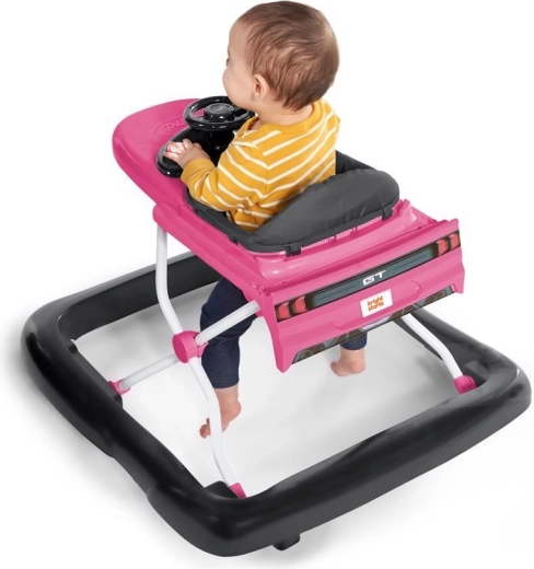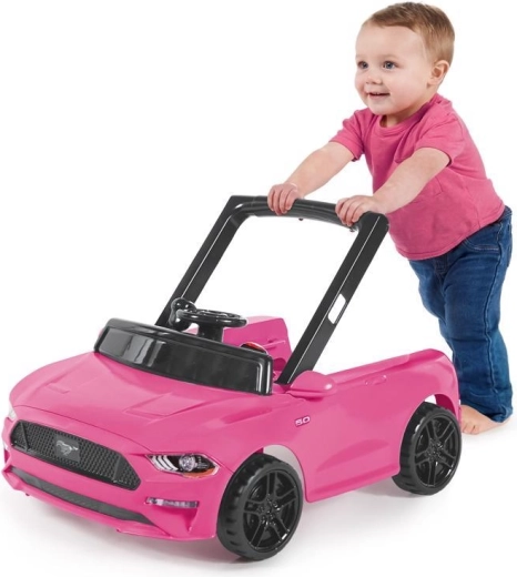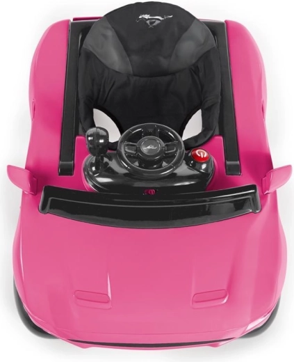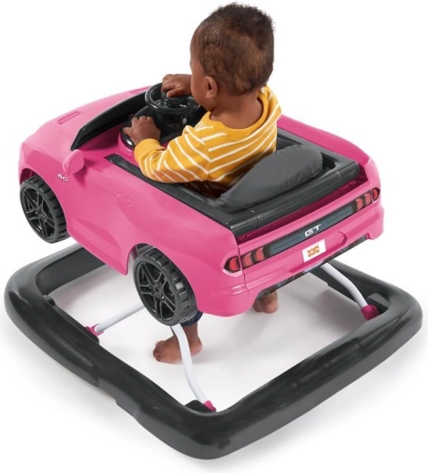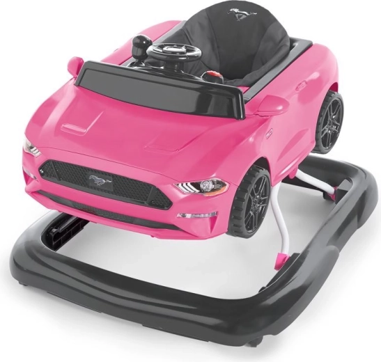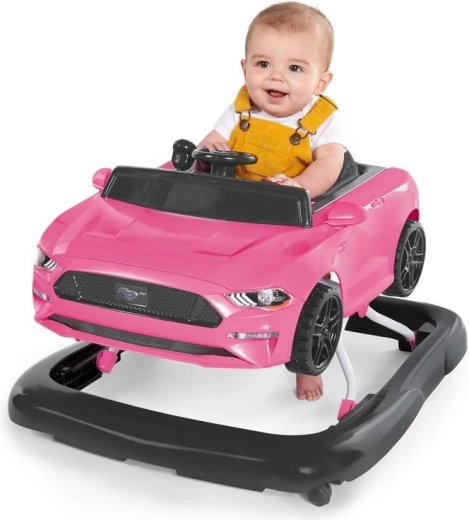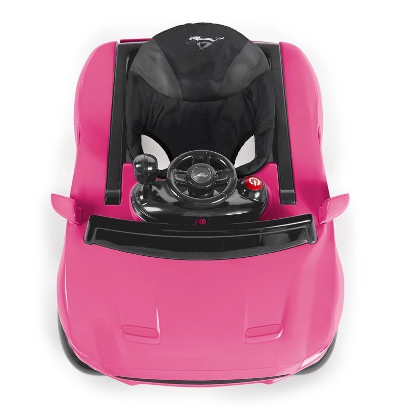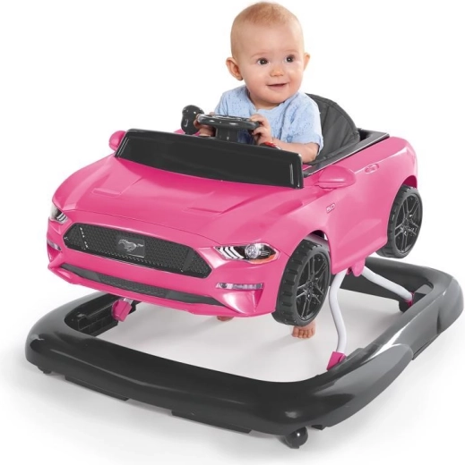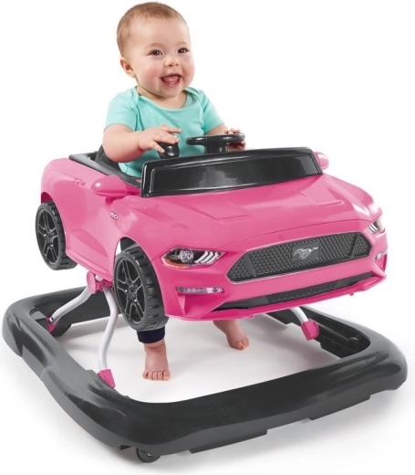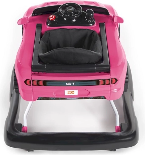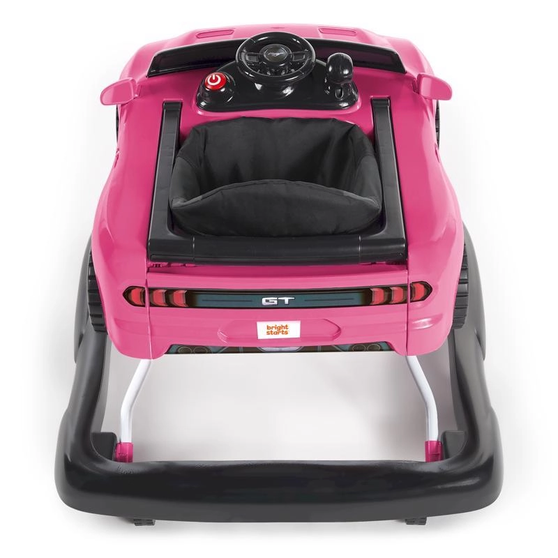 Trotteur pour bébé élégant 3-en-1 BRIGHT STARTS Ford Mustang en coloris rose, qui évolue avec votre enfant dès 6 mois. Propose trois modes d’utilisation – assise et déplacement, mode push avec poignée et possibilité de jeu simultané de deux enfants. Il dispose d’effets lumineux et sonores, d’un tableau amovible avec volant pour jouer au sol, de 3 positions de hauteur, d’un dossier haut confortable, d’un pliage facile et d’une housse de siège lavable.