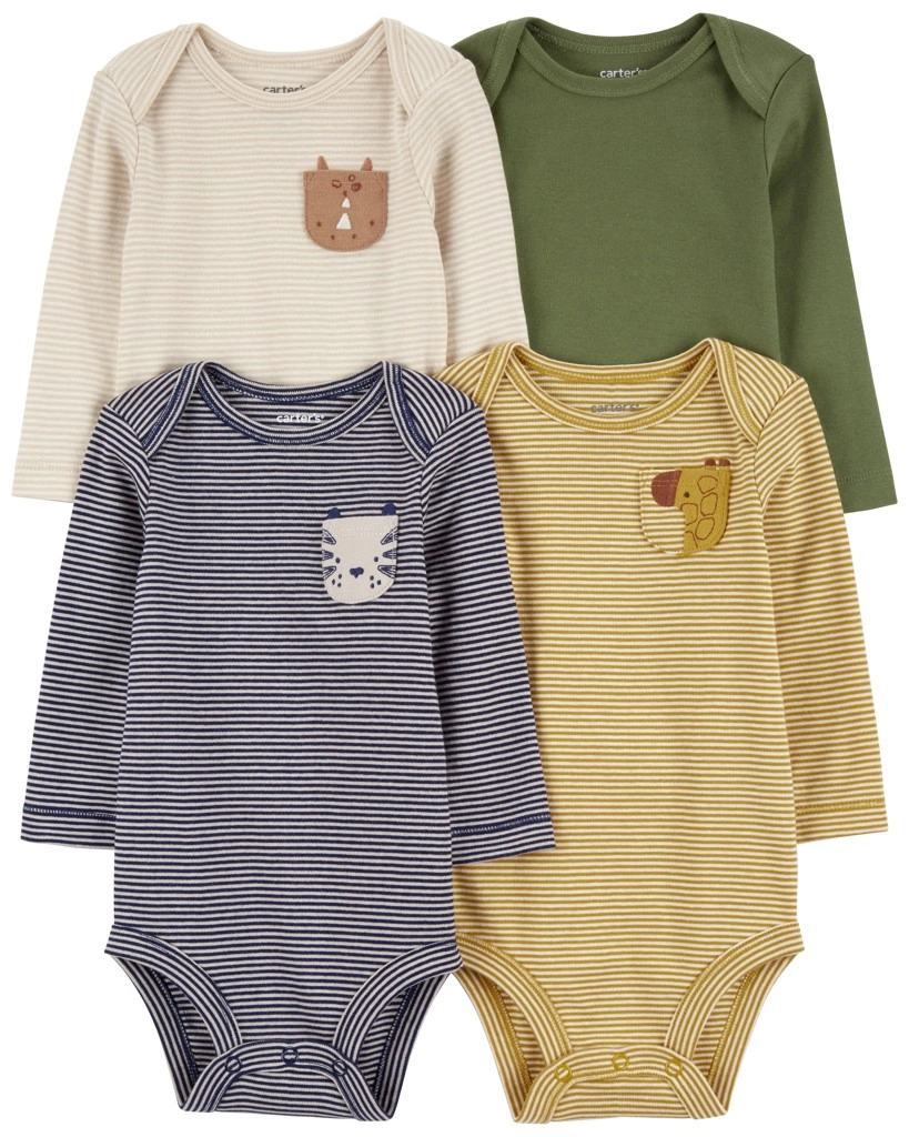 Découvrez un lot de quatre bodies pour bébé en coton 100 % extrêmement doux, idéaux pour le quotidien des nouveau-nés. Grâce à l’encolure américaine et aux boutons-pression entre les jambes, l’habillage et le changement de couche sont rapides et faciles. Des motifs et des couleurs stylés, associés au confort, à la respirabilité et aux pressions sans nickel, font de ce lot une base parfaite du trousseau.