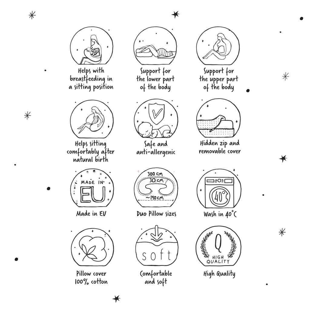 Grâce à sa longueur de 300 cm, le coussin crée un agréable « nid » qui améliore le positionnement et favorise la détente du corps. Sa forme en grand « C » facilite la recherche de la bonne position lors de l’allaitement, aide à réduire la tension dans les épaules et soutient une tenue ergonomique du bébé.