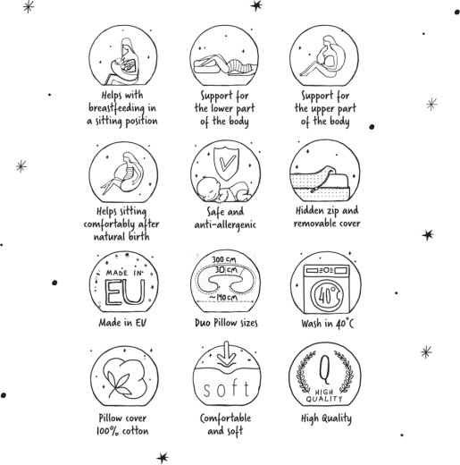 Le Cebuška Duo est conçu pour les mamans exigeantes qui recherchent une combinaison de confort, de soutien et de flexibilité pendant la grossesse et l’allaitement. Le système en deux parties avec des garnissages différents permet un ajustement précis : une partie souple sous la tête en fibre creuse avec traitement silicone et la partie principale, plus longue, en microbilles EPS qui épousent le corps et offrent un soutien stable.