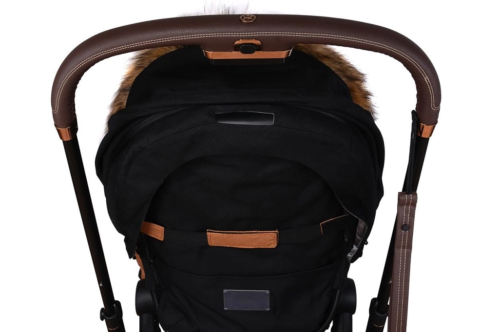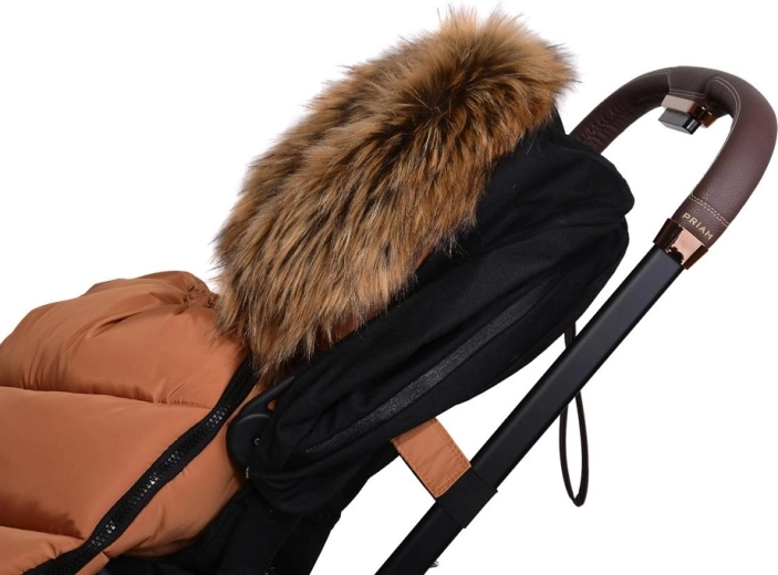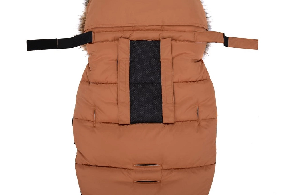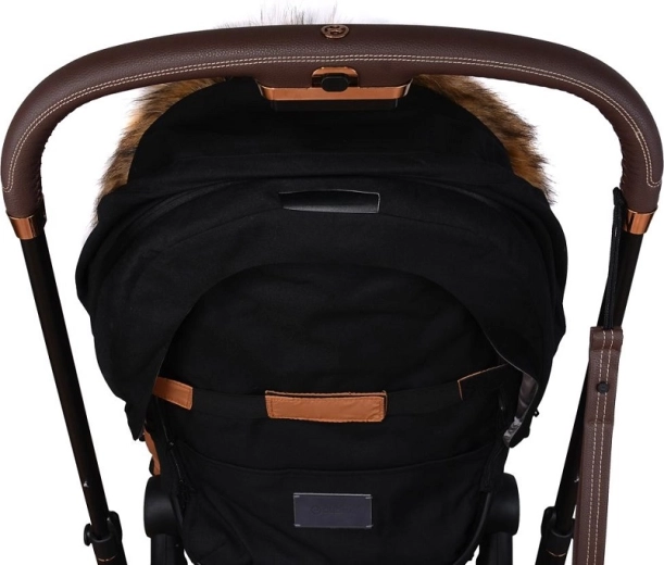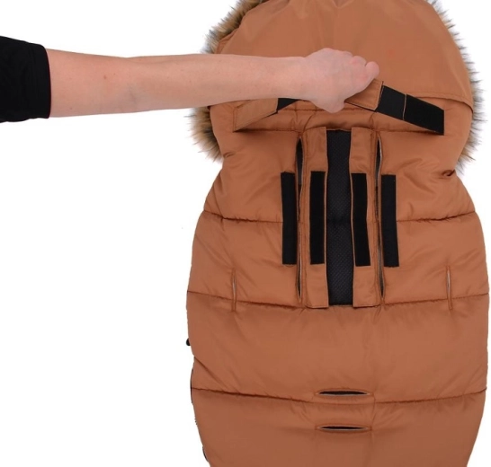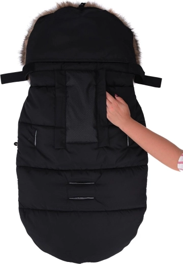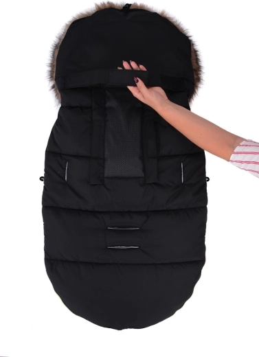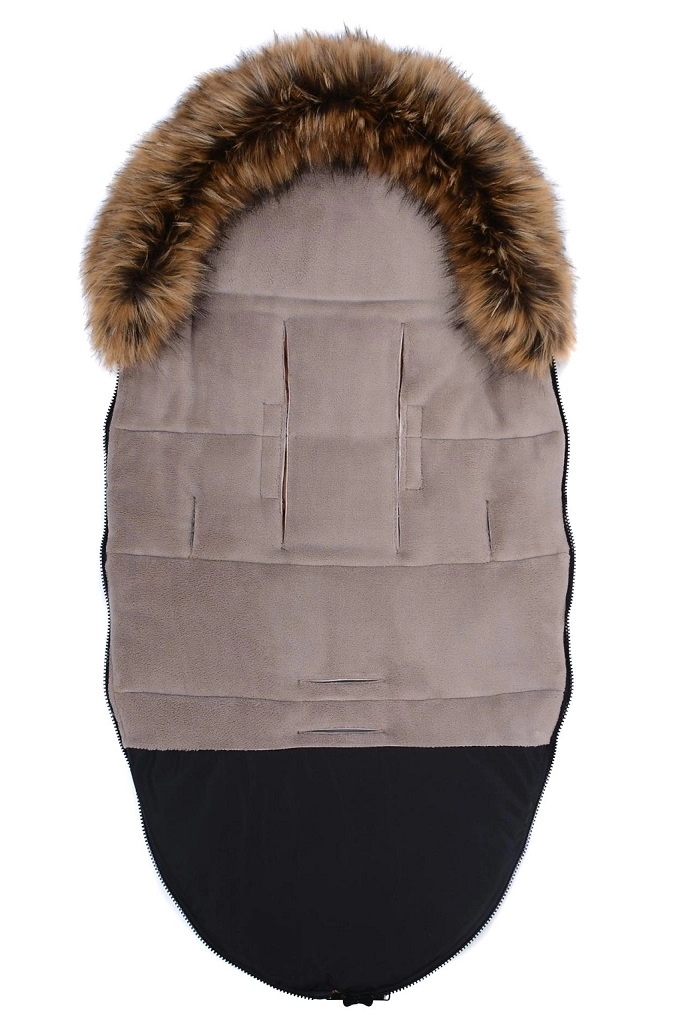 La fermeture zippée pratique permet un habillage rapide et une aération facilitée ; la partie avant peut être entièrement retirée des deux côtés. Grâce aux ouvertures pour harnais 5 points et à la sangle arrière pour fixer au dossier, la chancelière reste bien en place sur différents types de poussettes. Le look élégant est complété par une fourrure synthétique amovible sur la capuche.