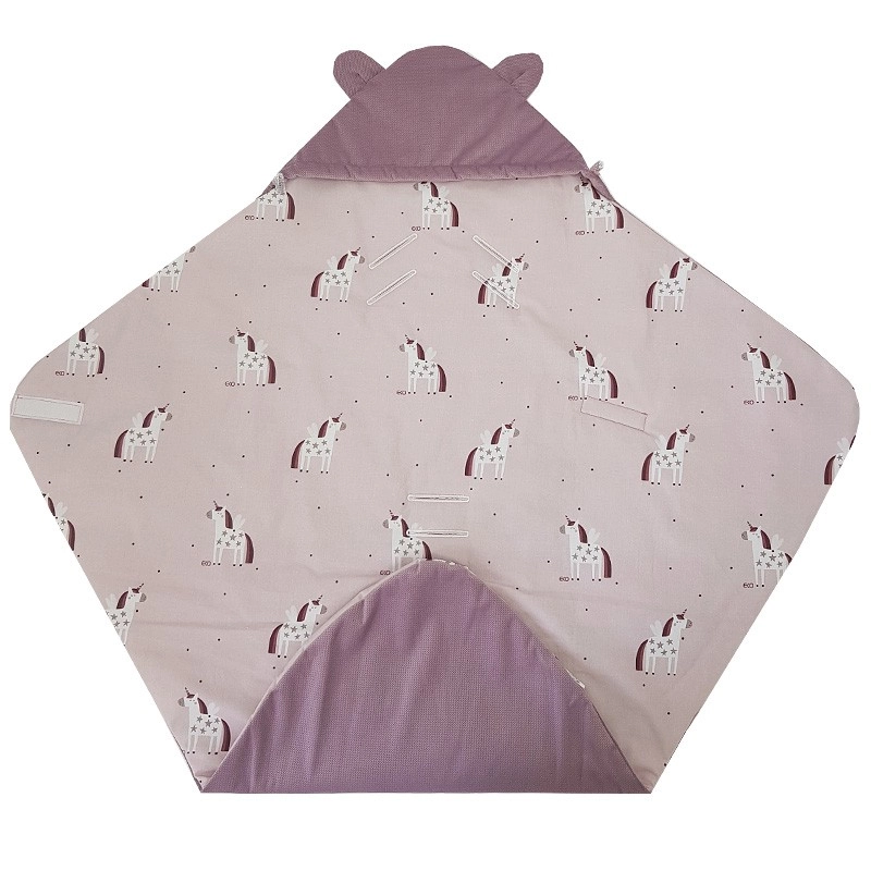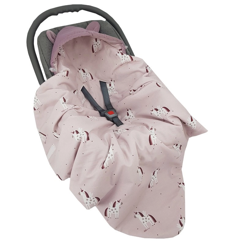Chancelière enveloppante pratique pour siège auto pour bébés de 3 à 18 mois, dans un design rose délicat avec motif Unicorn. Elle combine une surface douce VELVET/MINKY, une doublure en coton agréable et un garnissage hypoallergénique respirant. Grâce aux ouvertures pour les ceintures de sécurité, la chancelière s’attache facilement sans défaire les sangles et enveloppe bébé dans la chaleur et le confort. Indice thermique 2,5 TOG pour une utilisation toute l’année.