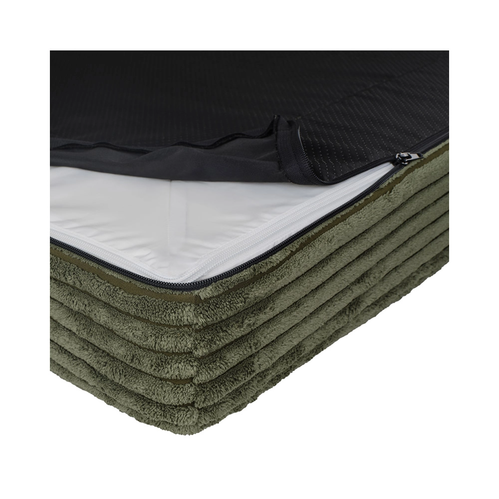 La housse en velours côtelé doux (100 % polyester) est moelleuse, à séchage rapide et résistante aux odeurs, certifiée OEKO-TEX Standard 100. Le noyau en mousse certifié CertiPUR-US ne contient pas de substances nocives. Grâce aux fermetures éclair YKK, la housse se retire facilement et se lave en machine à 30 °C. La couche intérieure imperméable protège le noyau de l’humidité et le dessous antidérapant maintient fermement le panier en place sur carrelage comme sur parquet flottant.