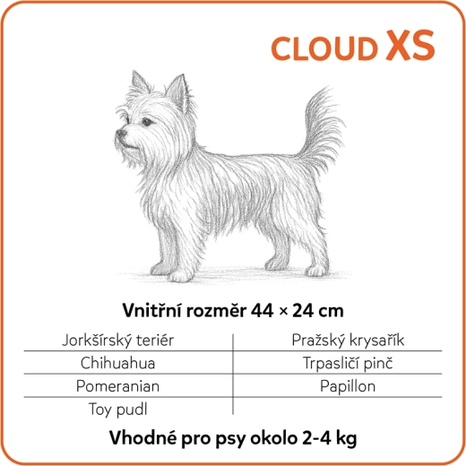 Cloud XS est un panier orthopédique confortable pour petits chiens et chiots, assurant un soutien correct du corps même pendant un long sommeil. La construction bi-couche (4 cm de mousse PU + 2 cm de mousse à mémoire de forme CertiPUR-US) répartit la pression de manière uniforme, amortit les chocs et apporte un soulagement notable aux articulations et à la colonne vertébrale sollicitées. Les bords hauts (13 cm) soutiennent la tête et créent un endroit calme, douillet et protégé pour se reposer.