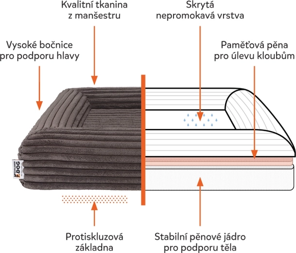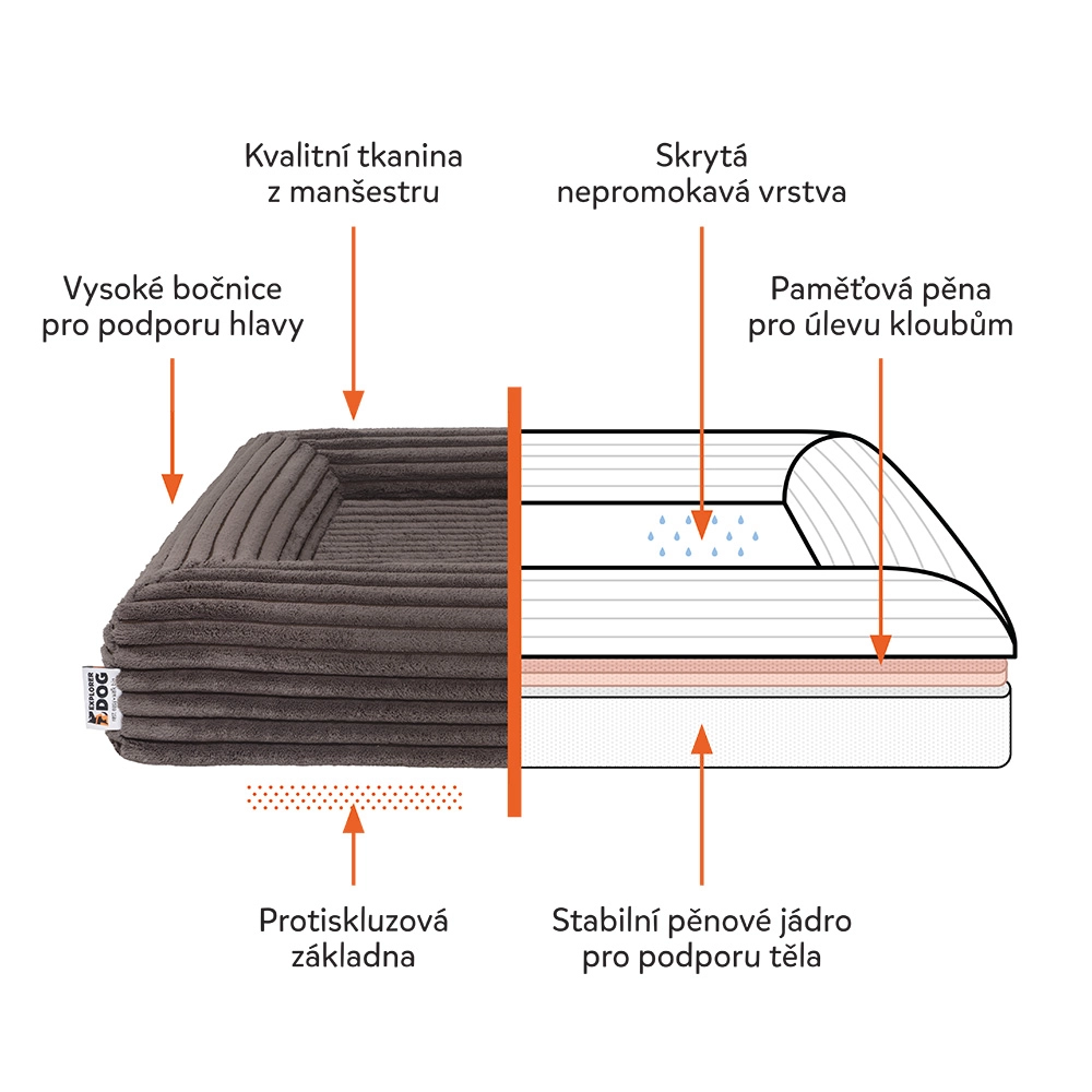 Offrez à votre chien un véritable repos. Le panier orthopédique Cloud XS associe un matelas bi-couche (mousse PU + mousse à mémoire de forme) pour soulager les articulations et la colonne vertébrale, des bords hauts pour une sensation de sécurité et une housse facilement lavable en velours côtelé avec certification OEKO-TEX. Une couche interne imperméable et un dessous antidérapant assurent la stabilité sur tout type de sol.