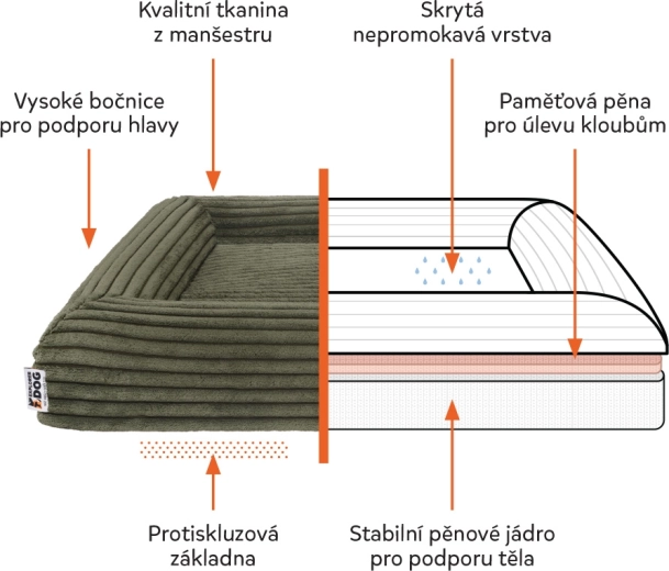 La housse en velours côtelé doux (100 % polyester) est agréable au toucher, sèche rapidement et est résistante aux odeurs. Elle répond à la norme OEKO‑TEX Standard 100, les mousses sont certifiées CertiPUR‑US – sans formaldéhyde ni métaux lourds. Grâce aux fermetures éclair YKK, la housse se retire facilement et se lave à 30 °C. Une couche intérieure imperméable protège le noyau de l’humidité et des saletés, et la face inférieure antidérapante maintient le panier bien en place.
