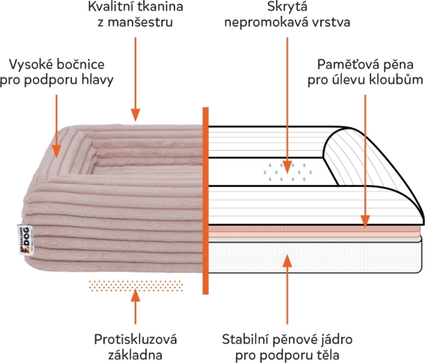 La housse en velours côtelé doux avec fermetures éclair YKK se retire facilement et se lave à 30 °C. La couche interne imperméable protège le noyau en mousse de l’humidité.