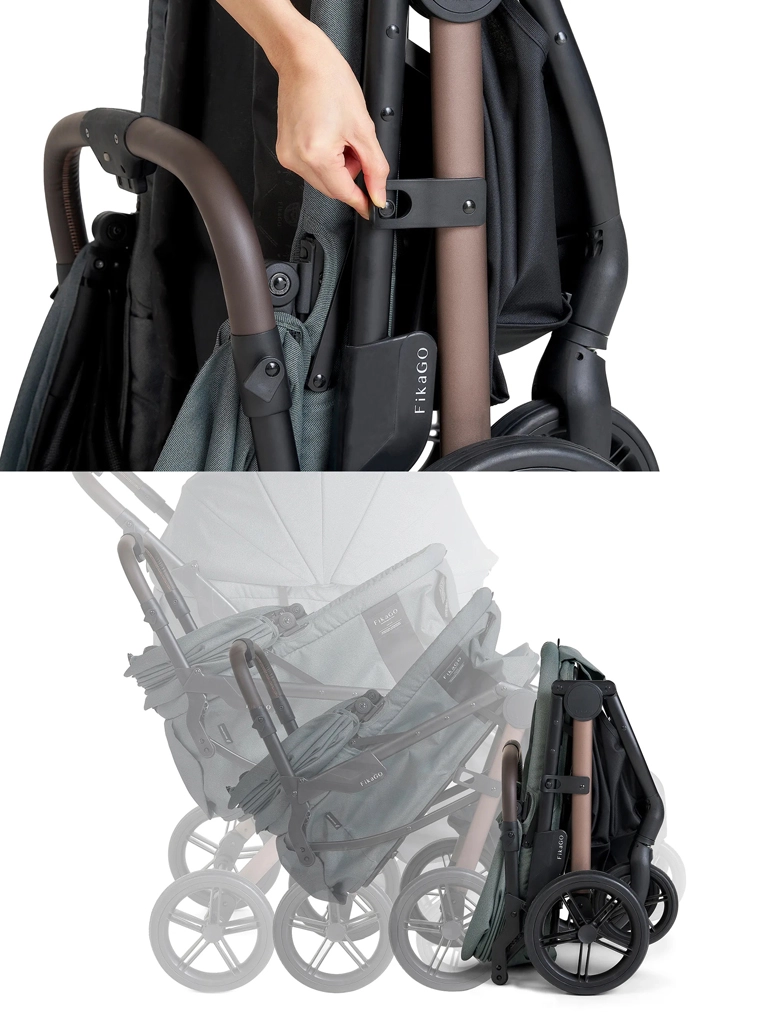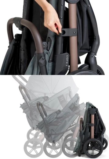 Manipulation facile et compacité grâce au pliage automatique à une main avec verrouillage automatique. Une fois pliée, la poussette tient debout seule, économisant de la place à la maison et dans la voiture. La poignée en cuir ergonomique est agréable au toucher et facilite la prise en main. Avec les roues avant pivotantes à 360° et la suspension intégrale, la conduite est fluide sur les trottoirs urbains comme sur les allées de parc.
