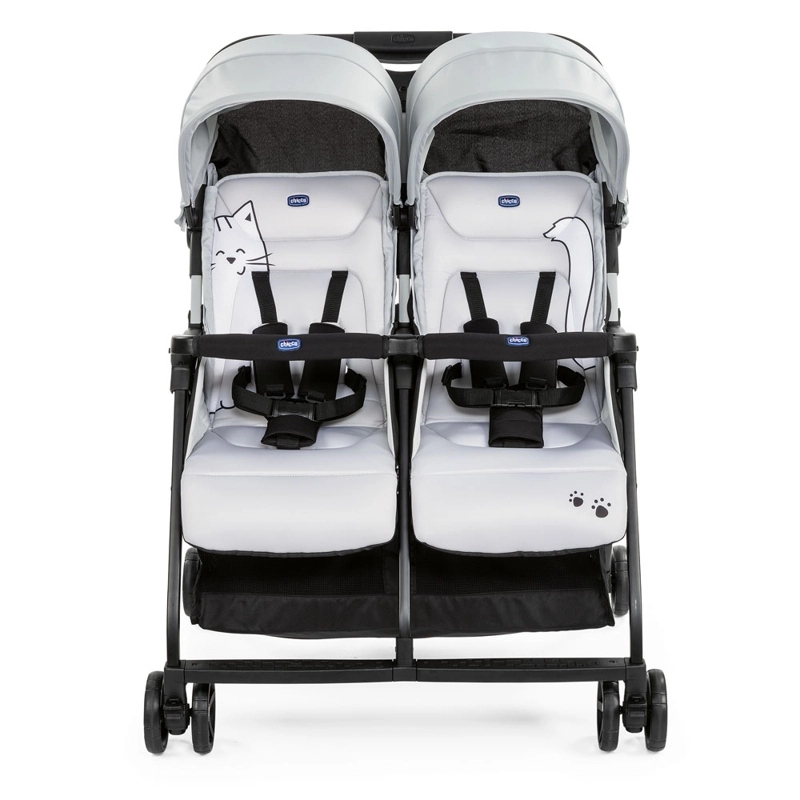 Poussette jumeaux CHICCO Ohlala Twin ultralégère et compacte au design Silver Cat, offrant confort dès la naissance, pliage à une main et sièges réglables indépendamment. Grâce aux harnais 5 points, au panier spacieux et à la housse de pluie incluse, elle est idéale pour les promenades quotidiennes comme pour les voyages.