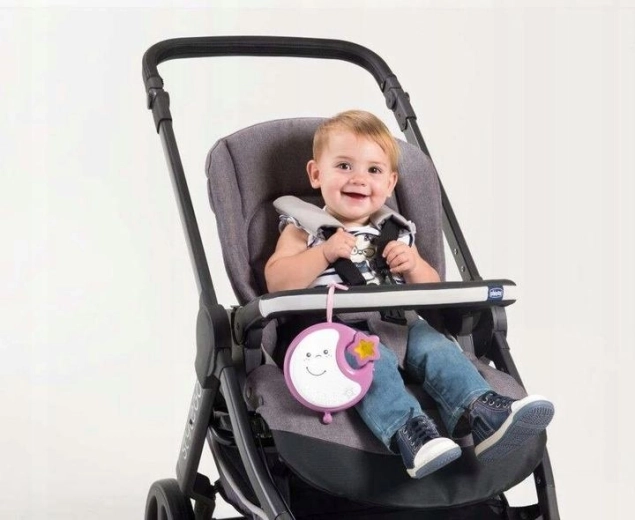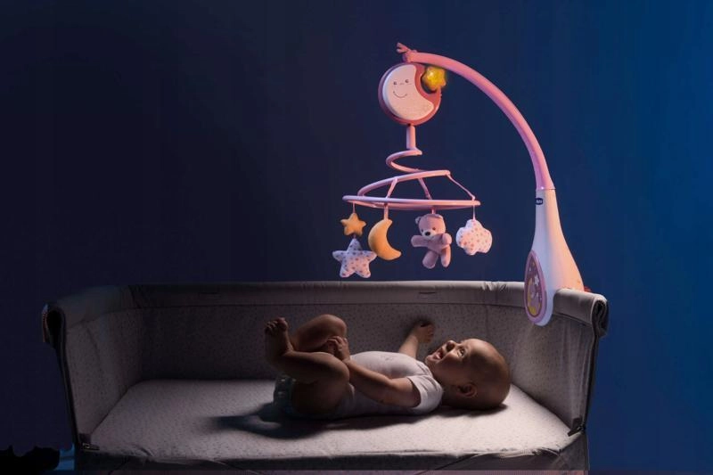 Grâce au boîtier électronique amovible avec veilleuse en forme de croissant de lune, le produit s’utilise aussi hors du lit – il se fixe aisément sur le côté du lit, sur la poussette ou sur l’arceau du siège auto. La spirale rotative en tissu doux et hypoallergénique avec quatre jouets suspendus stimule la vue et la concentration de l’enfant et favorise un endormissement calme.