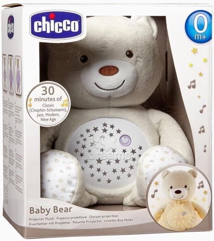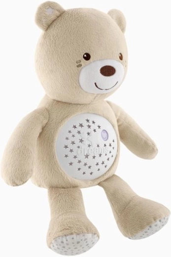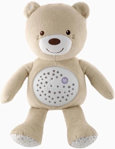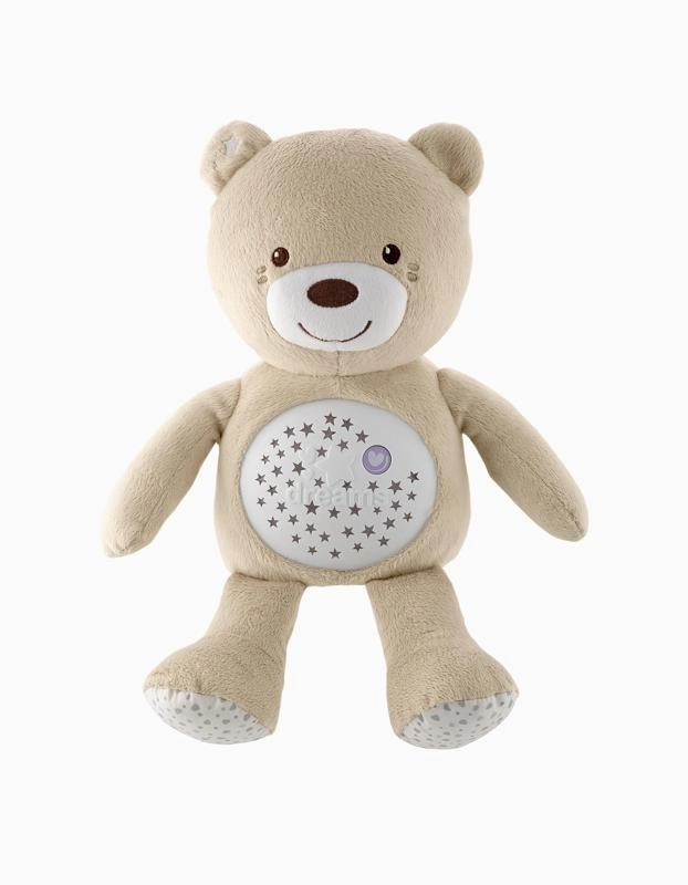 Le mignon ourson en peluche Chicco Baby Bear First Dreams apaise bébé avec une douce lumière et des mélodies. Il propose une projection du ciel nocturne, une veilleuse à intensité réglable et jusqu’à 30 minutes de musique incluant classique, jazz, soft rock, mélodies modernes, new age et bruit blanc. Il est doux, lavable après retrait du module électronique et convient dès la naissance.