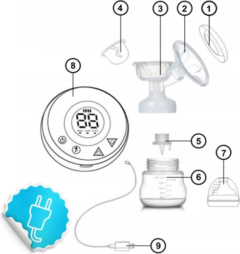 - Insert massant en silicone, valve, membrane, capuchon/tétine, câble USB, adaptateur secteur, 2× sachet pour le lait