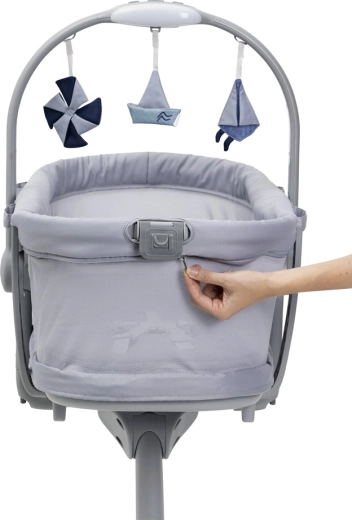 La réglage en hauteur par une seule pédale et le dossier ajustable apportent une ergonomie idéale pour l’endormissement et l’alimentation. Sont inclus une réduction douce, lavable et amovible pour nouveau-né et une arche électronique avec 3 jouets suspendus pour stimuler les sens. Le textile moderne confère un look intemporel; les housses se retirent et se lavent facilement.