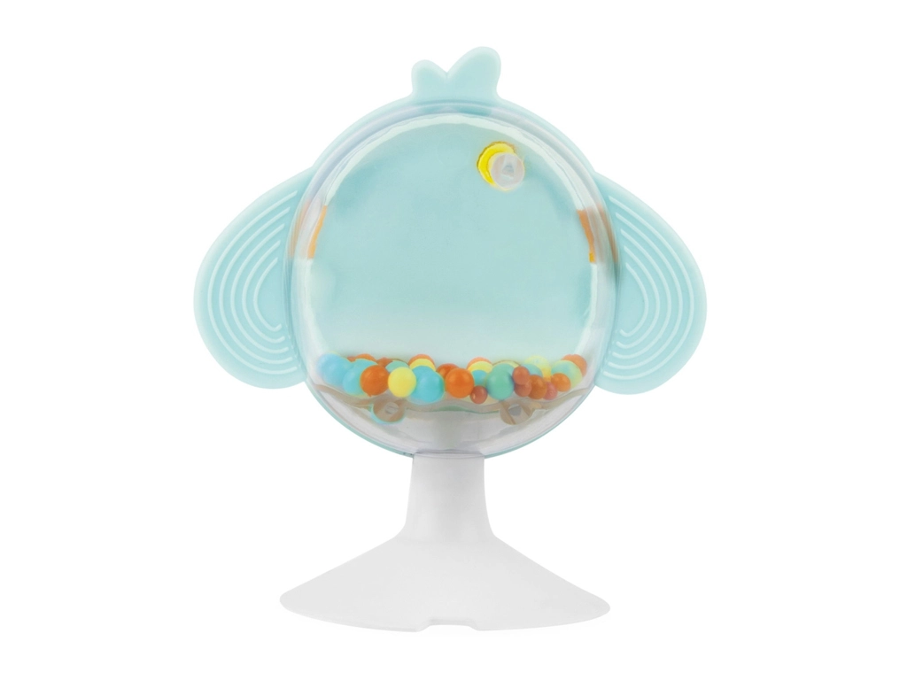 La ventouse stable maintient le jouet sur le plateau de la chaise haute. Les ailes texturées en plastique souple apaisent les gencives, et les billes colorées dans le corps stimulent l’ouïe et la vue.
