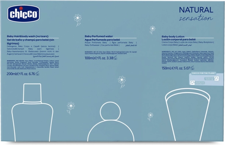 - Shampooing et gel lavant 2 en 1 200 ml; Lait corporel 150 ml; Eau parfumée pour bébé 100 ml