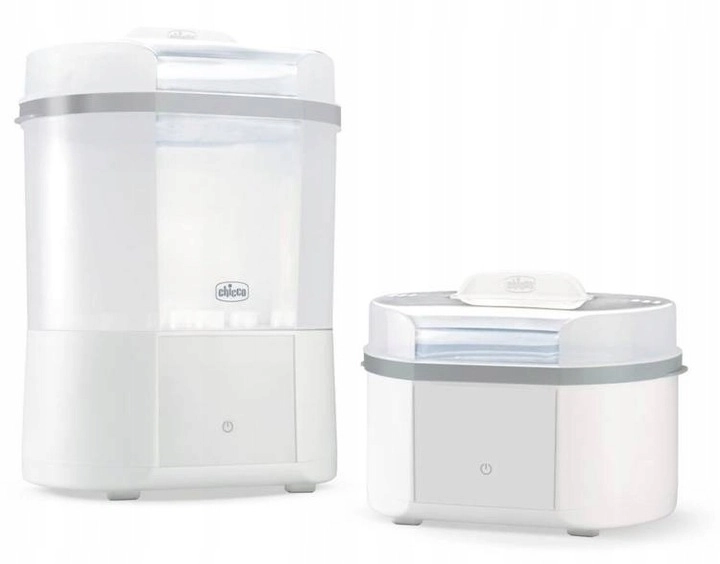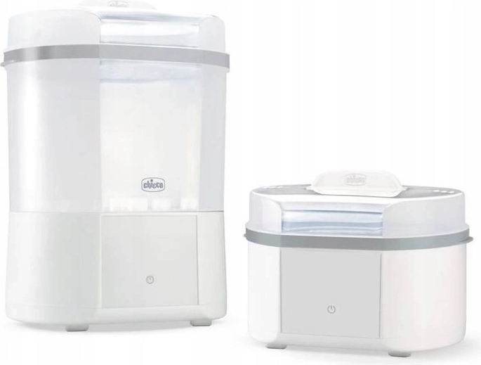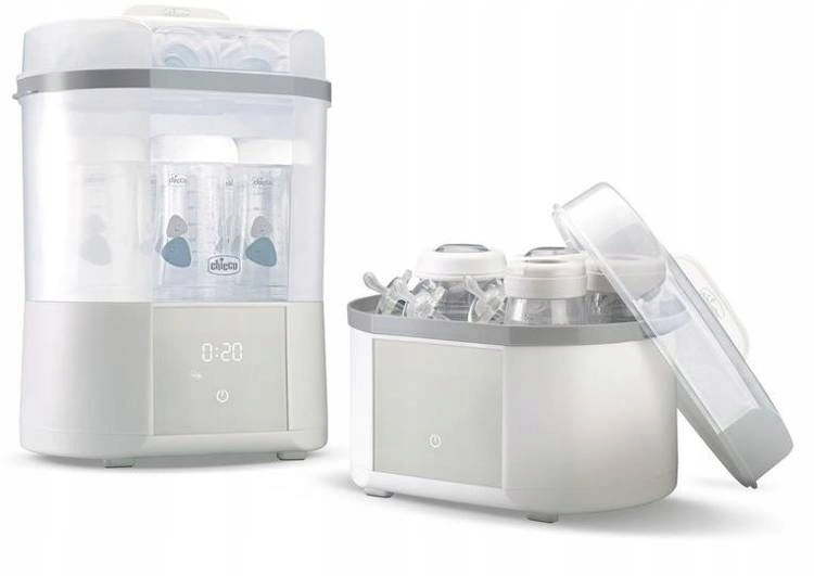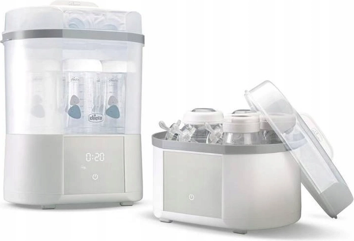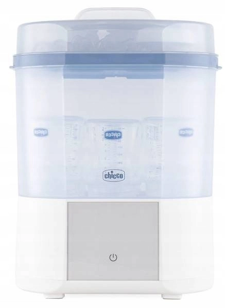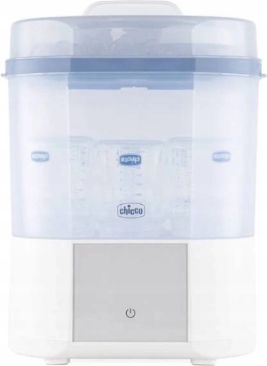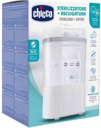 Le stérilisateur vapeur électrique CHICCO moderne assure une stérilisation naturelle en 5 minutes et, grâce à la fonction de séchage intégrée, élimine les gouttes et l’humidité résiduelle. Il peut contenir jusqu’à 6 biberons et accessoires, propose des programmes FULL et COMPACT, un départ différé et un filtre avancé pour un fonctionnement sûr sans particules de poussière. Un choix idéal pour des biberons, tétines et autres accessoires parfaitement hygiéniques.