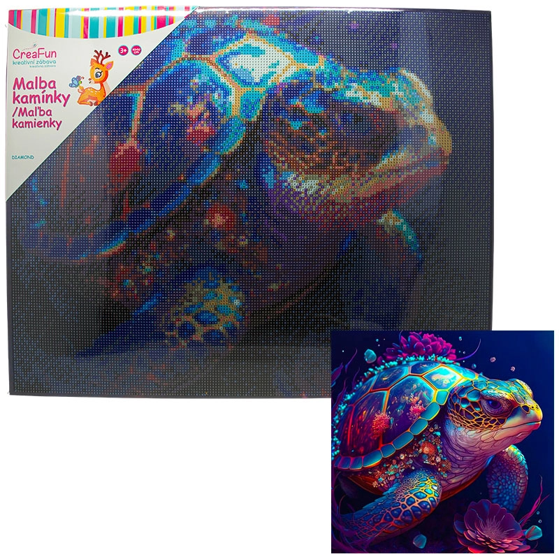 L’image de la tortue nocturne se distingue par des couleurs vives et un éclat spectaculaire obtenu en appliquant de petits strass sur une toile autocollante préimprimée avec un repérage complet des cases. Grâce à des matériaux de qualité et à un cadre en bois, l’œuvre finale est prête à être exposée et à être conservée durablement.