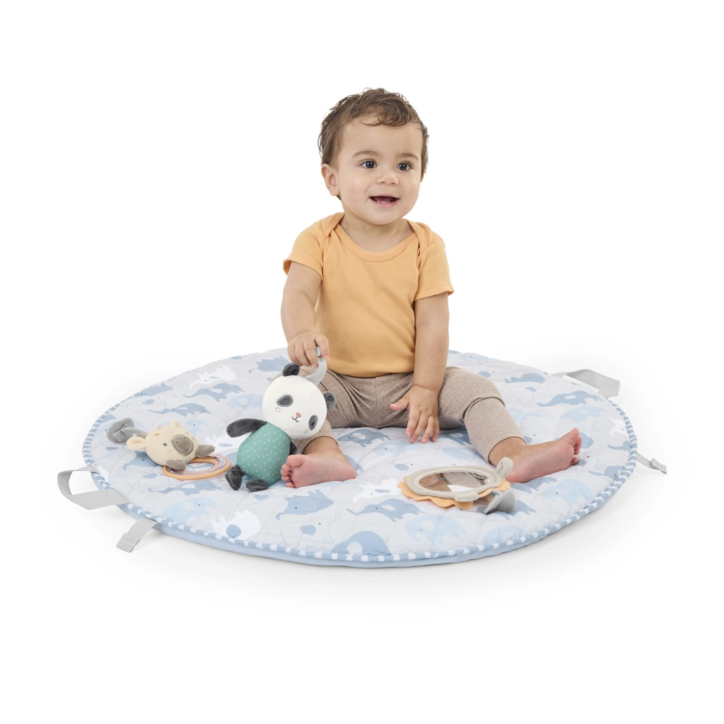 Le sens pratique au quotidien : l’arche SlimFold se replie aisément, le tapis se plie en une “pochette” compacte grâce à ses poignées intégrées, et les housses se lavent facilement en machine. Des matériaux sûrs et des éléments sensoriels intelligemment pensés (miroir, hochet, anneau de dentition, anneau en bois, peluche) éveillent la curiosité et favorisent un jeu apaisé.