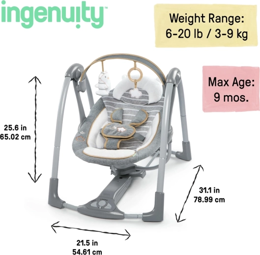Ingenuity Bella Teddy est une balancelle de voyage conçue pour le confort de bébé et la simplicité pour les parents. Grâce à la technologie Hybridrive, les piles durent plus longtemps, tandis que le capteur de poids maintient automatiquement la vitesse de balancement choisie à mesure que l’enfant grandit. Le design neutre convient aussi bien aux filles qu’aux garçons et en fait un excellent cadeau de naissance.