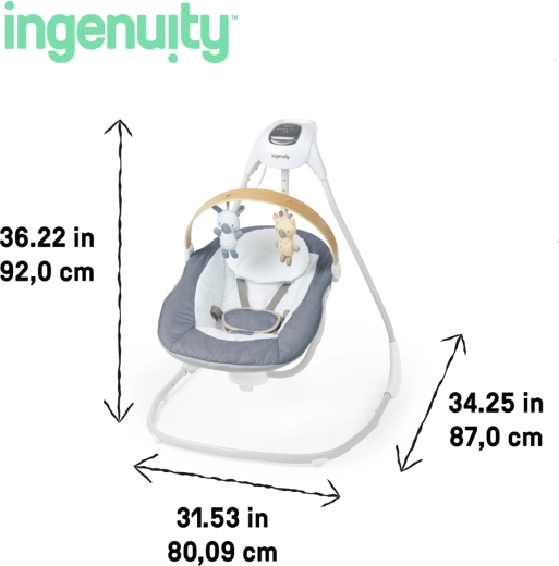 Ingenuity SimpleComfort Chambray est une balançoire pour bébé bien pensée, alliant confort, sécurité et divertissement. Le siège pivotant à 180° permet un balancement dans trois directions, afin d’adapter facilement le mouvement et l’orientation vers le parent. La technologie TrueSpeed maintient la vitesse de balancement choisie en fonction du poids de l’enfant et le moteur WhisperQuiet garantit un fonctionnement ultra silencieux.