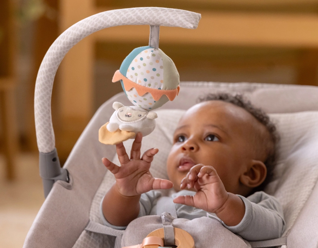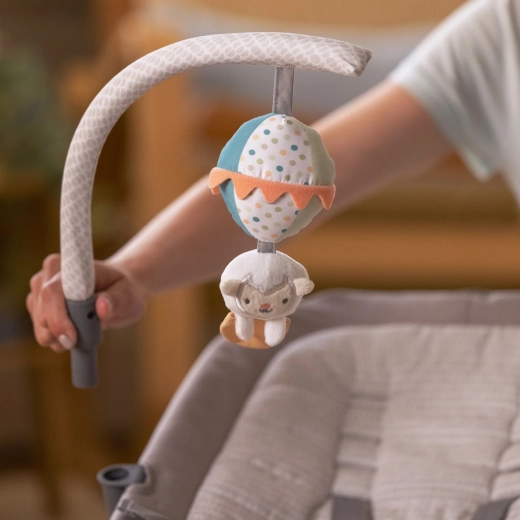 Bébé s’amuse avec l’arche amovible et ses deux jouets : un ballon en peluche doux et un anneau en bois avec étiquettes pour explorer et saisir. Le transat offre 2 positions d’inclinaison pour un bon soutien et un confort optimal. Le cadre minimaliste, les matières tissées et le centre matelassé s’intègrent parfaitement à un intérieur moderne.
