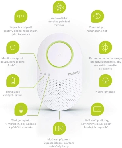 Grâce à la détection unique de la pose du bébé, Nanny vous avertit si le bébé est sur le capteur et que le moniteur n’est pas activé. Le test automatique à l’allumage contrôle l’état de l’appareil ainsi que la durée de vie du capteur. Pour une utilisation nocturne confortable, la veilleuse intégrée s’accompagne d’un atténuateur automatique des indicateurs et d’un contrôle de la température ambiante, qui aide à prévenir la surchauffe – l’un des facteurs de risque du SMSN.
