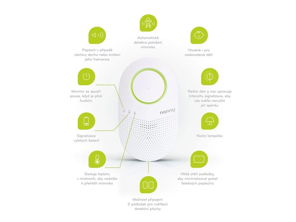 JABLOTRON Nanny 3 BM-03 est un moniteur de respiration moderne qui apporte de la sérénité aux parents et un sommeil sûr aux bébés. L’appareil surveille en continu l’activité respiratoire et alerte en temps utile en cas d’arrêt ou de ralentissement dangereux de la respiration. Il convient également aux prématurés dès 1 kg et répond aux exigences strictes d’un dispositif médical certifié de classe IIb.