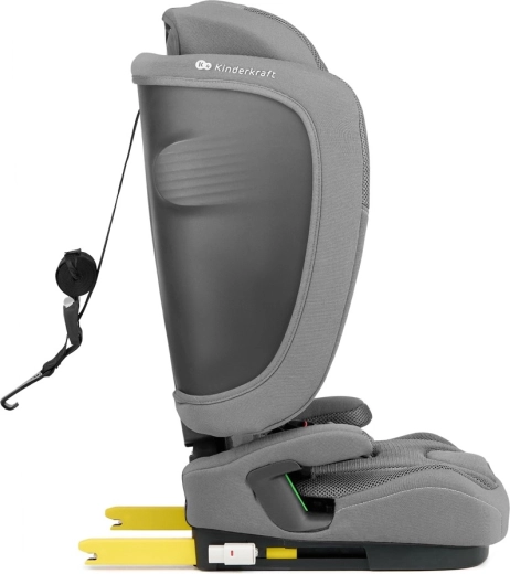 Fixation stable grâce à l’ISOFIX et à la sangle supérieure. Un capteur électronique avertit si le Top Tether n’est pas correctement sécurisé (lorsque l’enfant est correctement attaché).