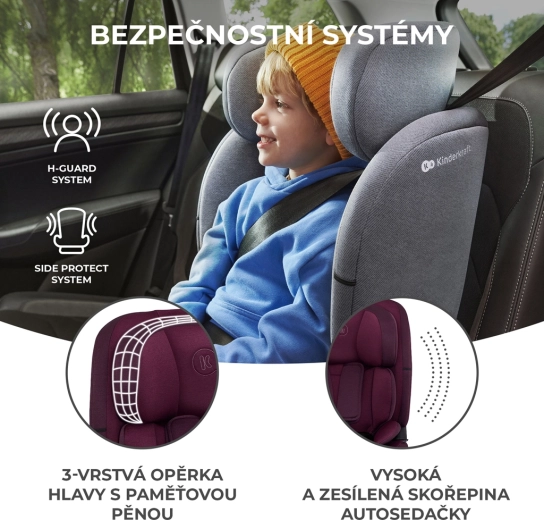 La sécurité est renforcée par les protections latérales hautes SIDE PROTECT SYSTEM et l’appui‑tête triple couche H-GUARD avec mousse à mémoire de forme, qui absorbent efficacement l’énergie d’un impact. Pour un confort optimal sur tous les trajets, le RECLINING offre 5 inclinaisons, une assise large, un rembourrage doux et un insert amovible pour les plus petits. La housse est lavable en machine, et des crochets latéraux maintiennent les harnais lors de l’installation de l’enfant.