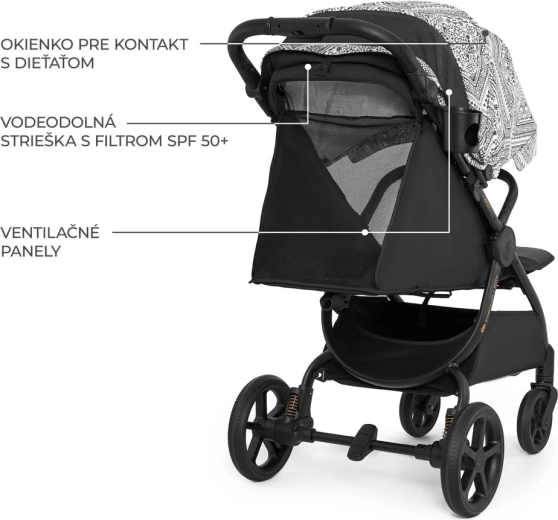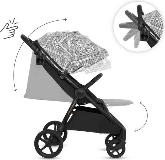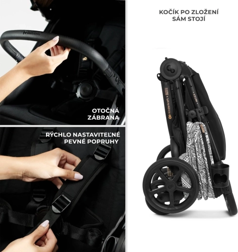 La grande capote imperméable avec UPF50+ protège du vent, de la pluie et du soleil; le panneau de ventilation et la fenêtre de contact avec l’enfant assurent une circulation d’air optimale et une bonne visibilité. La suspension complète et les grandes roues increvables maîtrisent aussi bien les pavés que le gravier, tandis que les roues avant avec rotation à 360° et possibilité de verrouillage améliorent la stabilité sur les terrains plus exigeants. Le pliage à une main au format compact avec protection du revêtement contre la saleté facilite le transport et le rangement.