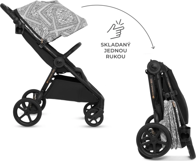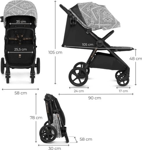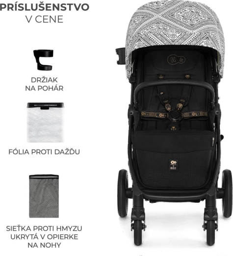 L’équipement comprend une moustiquaire intégrée dissimulée dans le repose-jambes, un porte-gobelet et une habillage pluie. La sécurité est assurée par des harnais rembourrés à 5 points avec réglage rapide à une main et une barre rotative et escamotable pour installer facilement l’enfant. Le panier spacieux d’une capacité de 5 kg accueille jouets et courses. Le châssis est compatible avec les sièges auto 0–13 kg à l’aide d’adaptateurs universels (vendus séparément).