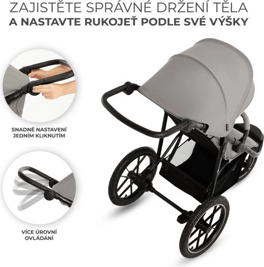 Le dossier réglable jusqu’à la position allongée, le grand repose-jambes et la poignée à hauteur réglable offrent un confort maximal. La capote avec fenêtre facilite le contact visuel avec l’enfant.