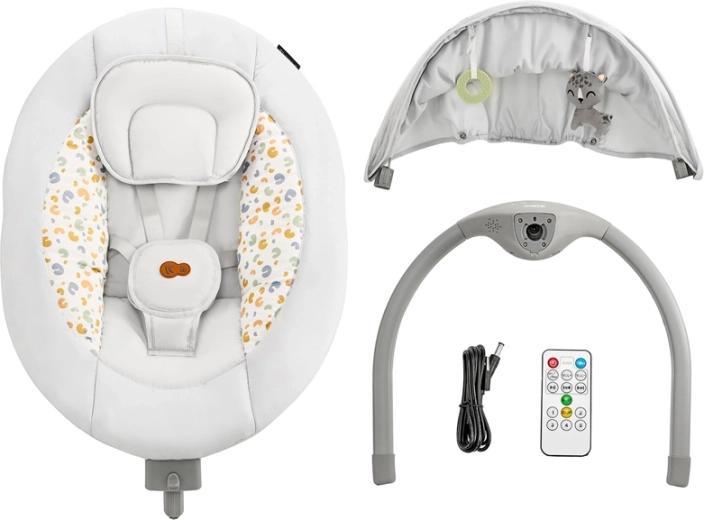 Le panneau de commande propose une minuterie 8/15/30 min et une télécommande avec une portée jusqu’à 8 m. La structure légère et pliable, l’arche réglable avec 2 jouets en peluche et la housse facile d’entretien s’intègrent à tous les intérieurs. L’alimentation est assurée par un adaptateur secteur (long câble inclus) ou par piles.
