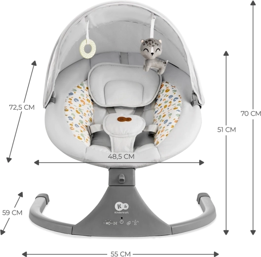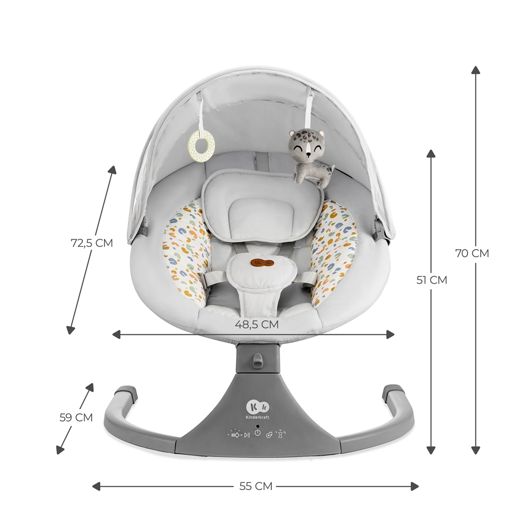 Apaisez votre bébé en un instant avec le transat et berceau 2-en-1 Kinderkraft LUMI dans l’élégante teinte Premium Light Grey. Le mouvement latéral unique imite les mouvements naturels dans le ventre, tandis que les 5 vitesses de bercement, les 12 mélodies avec réglage du volume et la lecture Bluetooth/USB favorisent un endormissement paisible. Pour un confort maximal, il dispose d’une télécommande, d’un rembourrage doux avec appui-tête et d’un harnais de sécurité à cinq points.