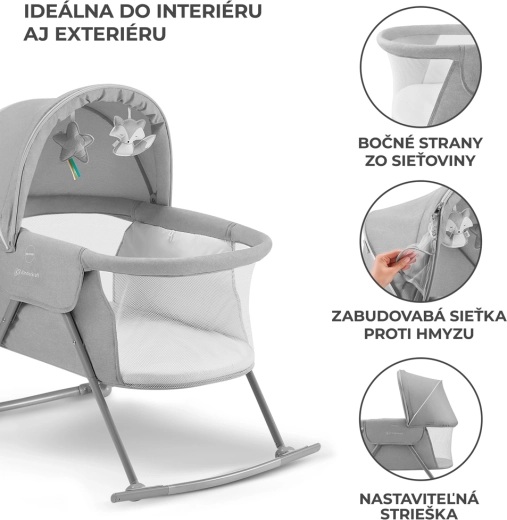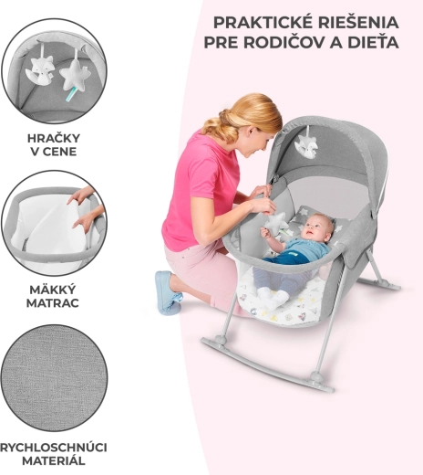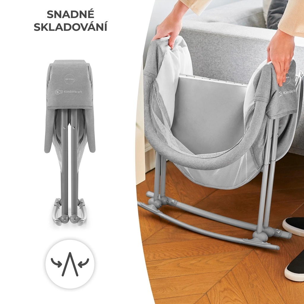 Le lit bébé pratique 3-en-1 KINDERKRAFT Lovi sert de lit, de berceau et de lit de voyage. Il est léger et compact, avec un pliage rapide sans outils, une fonction de balancement, une capote amovible avec moustiquaire intégrée et des côtés en maille respirante pour un sommeil sûr et confortable dès la naissance jusqu’à 9 kg.