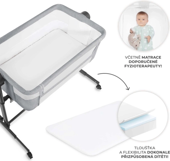 Il comprend un matelas semi-ferme recommandé par des physiothérapeutes – il offre un bon soutien à la colonne vertébrale et à la tête, est résistant à l’humidité, aux moisissures et aux acariens et est fourni avec un drap-housse lavable. L’inclinaison à deux positions aide en cas de rhume ou de régurgitations fréquentes. Quatre roulettes avec blocage facilitent le passage d’une pièce à l’autre, pour garder votre enfant toujours à proximité.