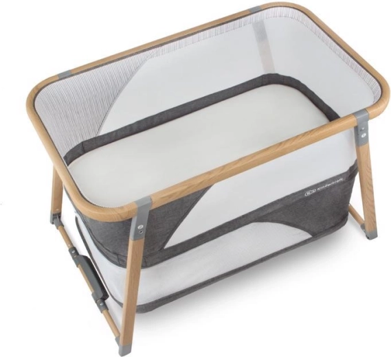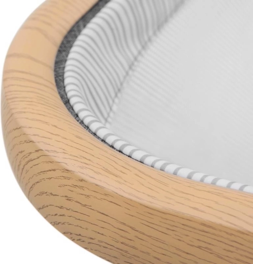 Les panneaux en maille favorisent la circulation de l’air et permettent un contact visuel avec l’enfant, tandis que le cadre en aluminium au décor bois garantit la stabilité.