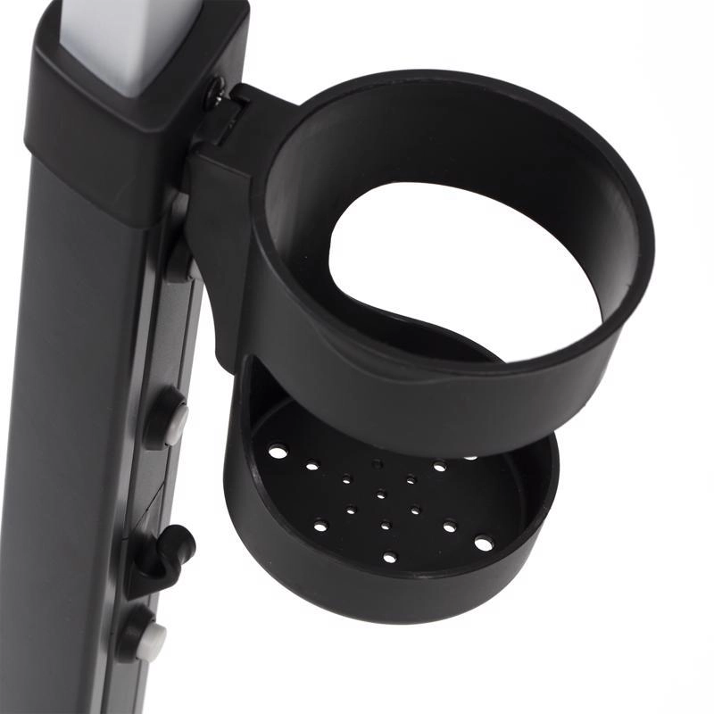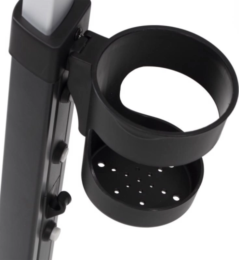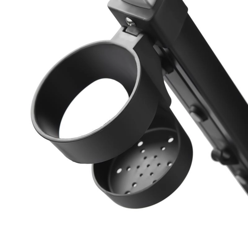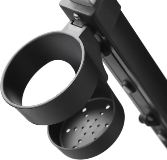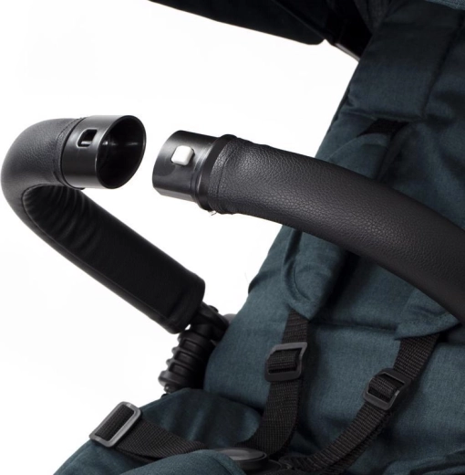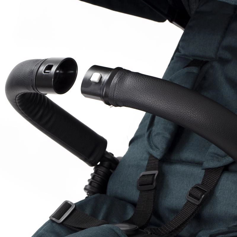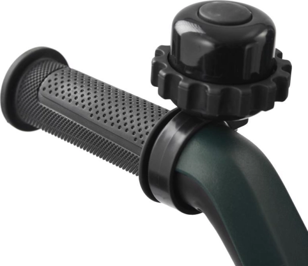 Poignée télescopique avec boutons de réglage rapide, frein de stationnement et accessoires complets : porte-gobelet, sonnette, sac/à dos et panier.